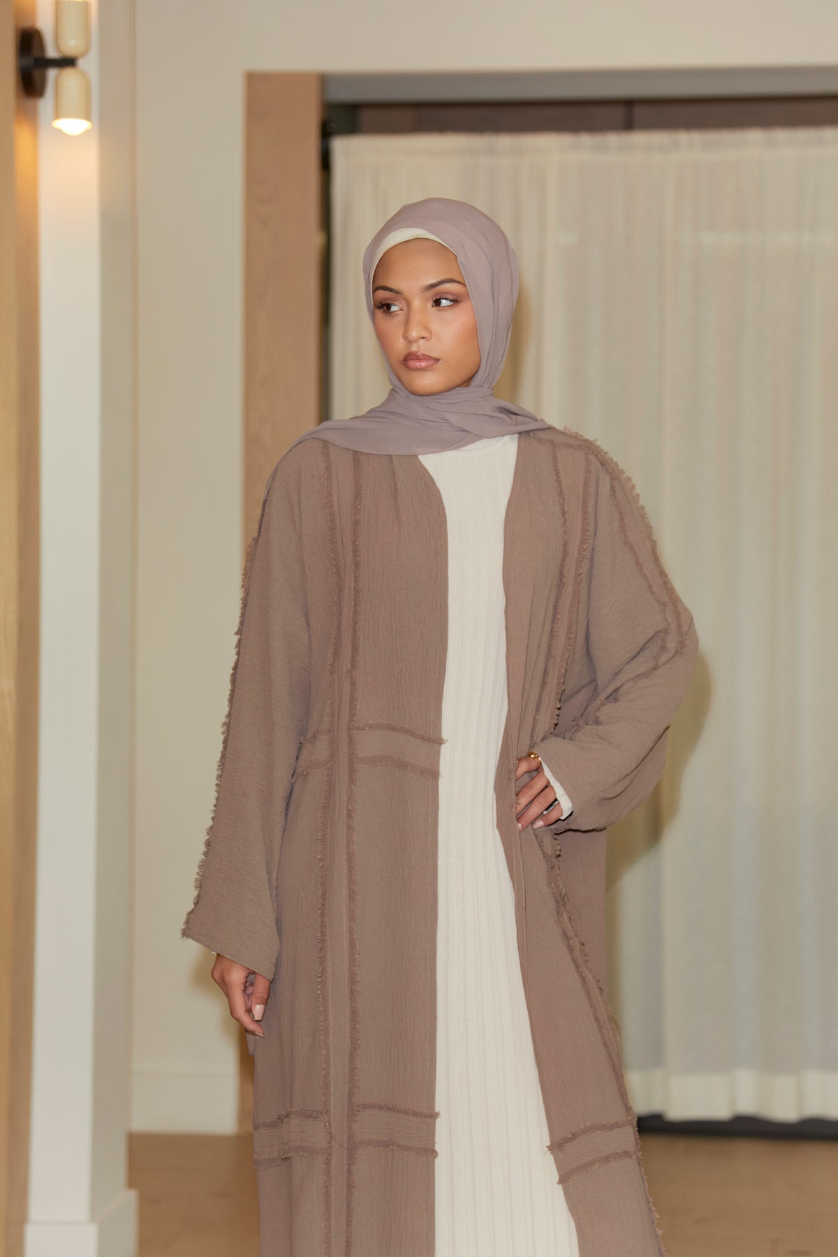 Introducing the most effortlessly elegant abaya you will have in your wardrobe! Featuring delicately frayed trims to allow you to dress it up or down, this abaya will soon become your go-to!