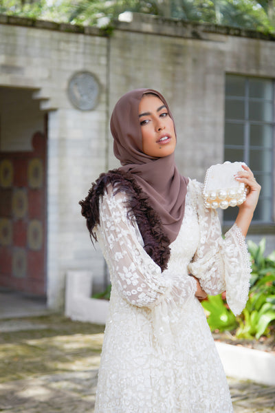 Cut, dyed and sewn to perfection by hand, we chose this fabric to make hijab styling comfortable and versatile enough for daily, occasion, and formal-wear alike. This hijab has a playful silhouette with a stunning combination of 3D silk flowers and cloud-like feathers lining the trim.