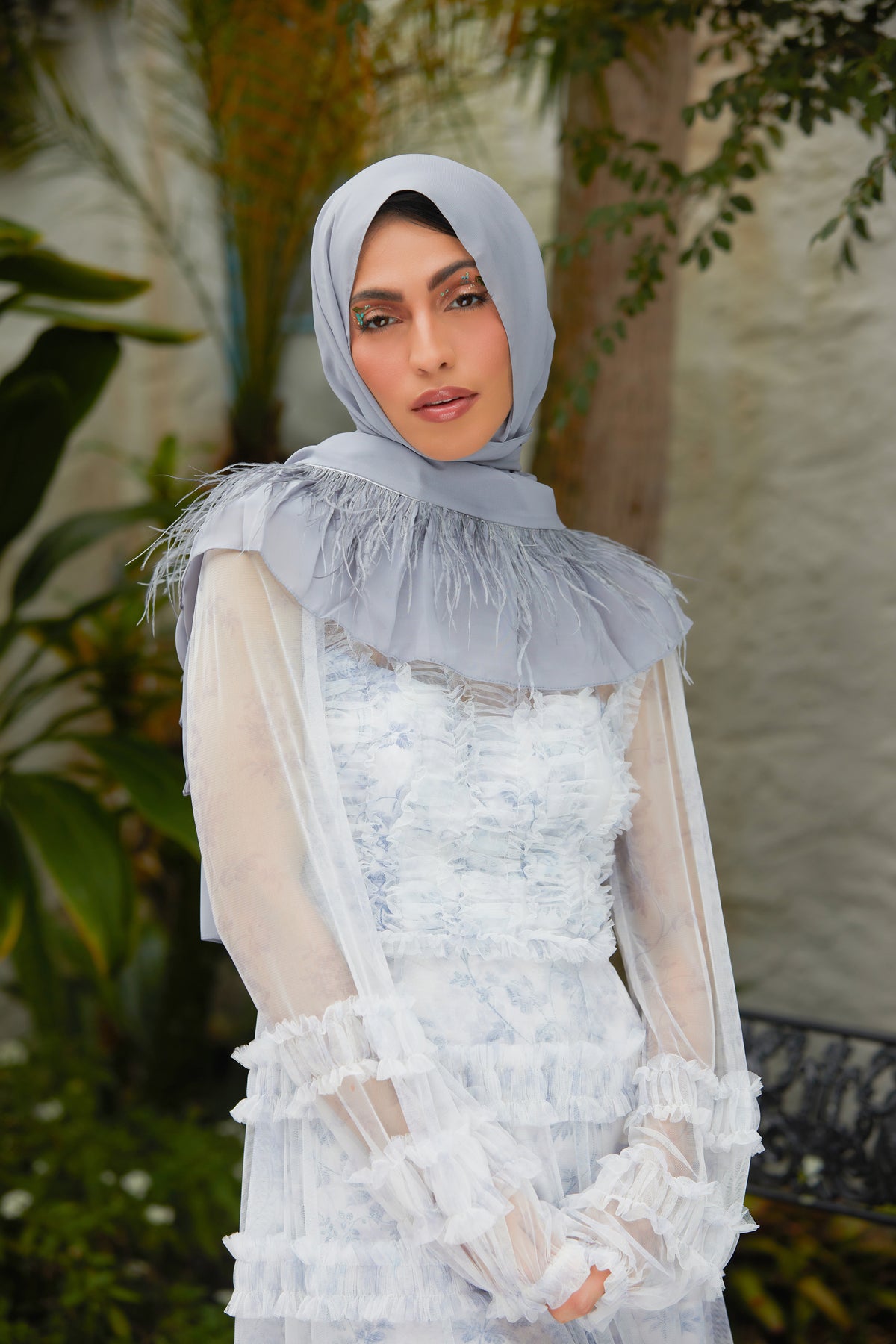 Cut, dyed and sewn to perfection by hand, we chose this fabric to make hijab styling comfortable and versatile enough for daily, occasion, and formal-wear alike. The ruffle trim has been elevated with delicate grey feather details on one end of the hijab, ensuring you feel elegant and powerful where ever your day takes you!